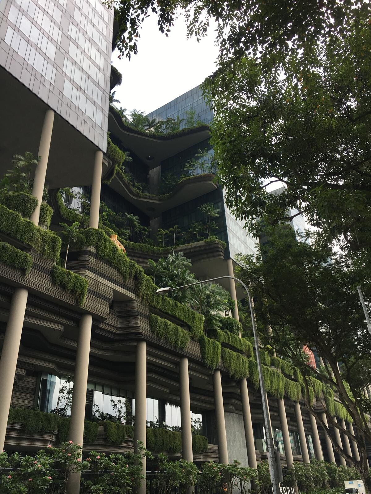 The building is located at the Hong Lim Park in Singapore. This park was the first park built here in 1855. The park has a diameter of 9400m 2 of accessible green and this building is located right next to the park and is used as an office/ hotel. A regulation in Singapore is that the greenery removed from the area a building needs to be places in must contain the same amount of greenery (or more) in the building plans as what went to waste in the first place including balconies and terrasses containing accessible green spaces.